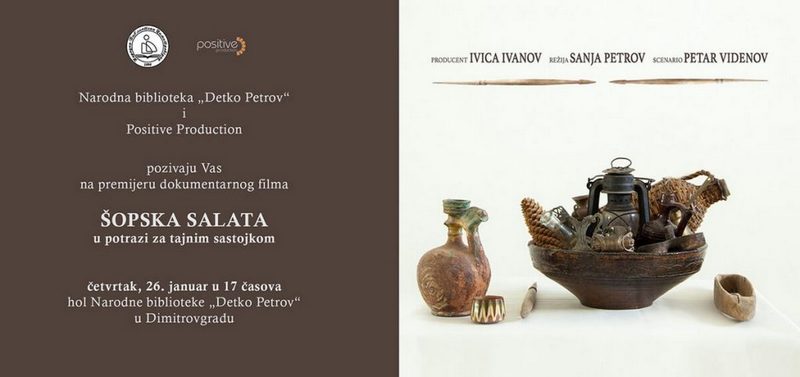 U četvrtak 26.januara(sutra) sa početkom u 17 časova u Holu Narodne biblioteke “Detko Petrov” biće premijerno emitovan dokumetarac “Šopska salata-u…