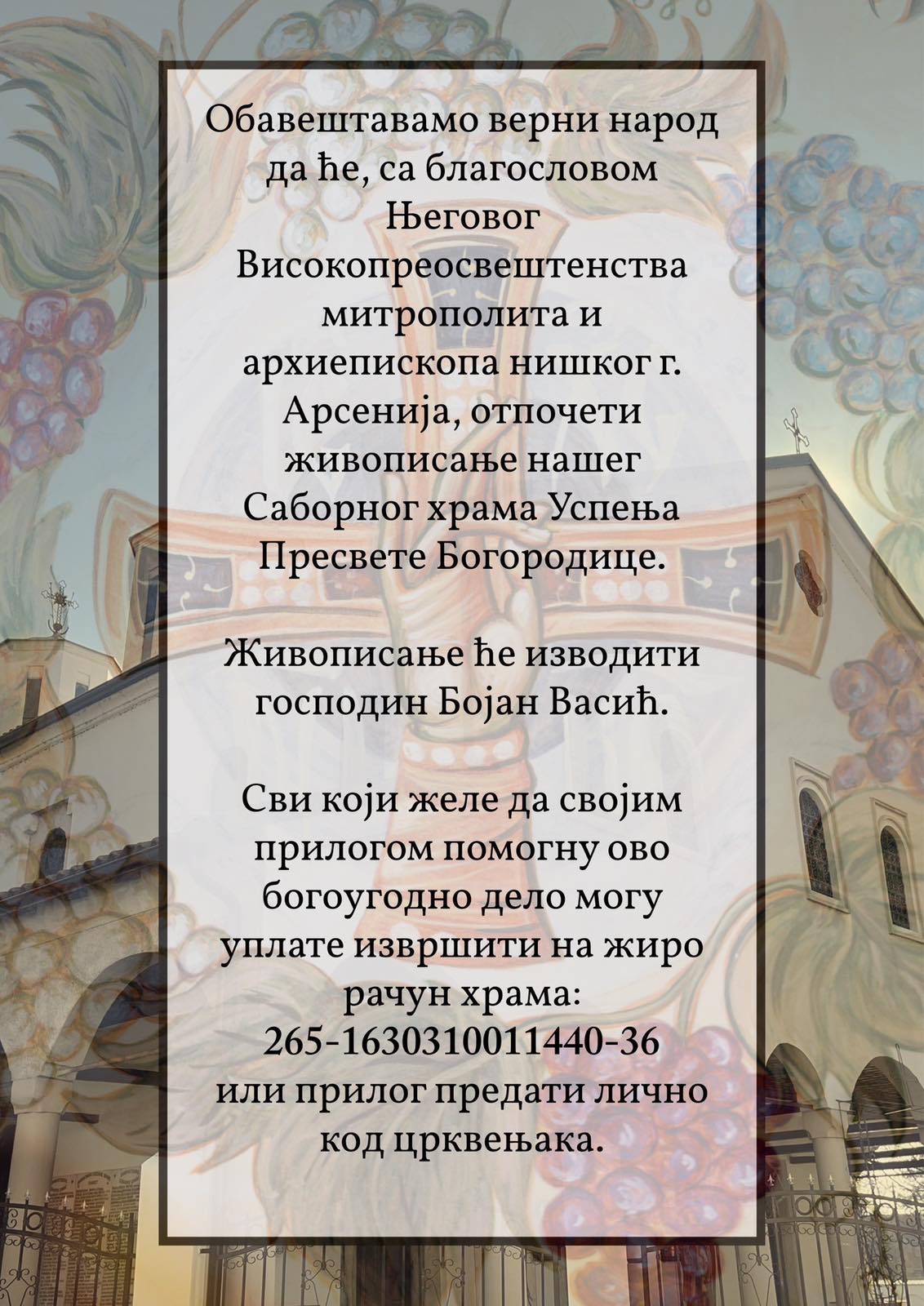 Početak živopisanja označava novi korak u uređenju hrama, ali i priliku da se verni narod uključi u stvaranje duhovnog i kulturnog nasleđa koje će trajati vekovima.