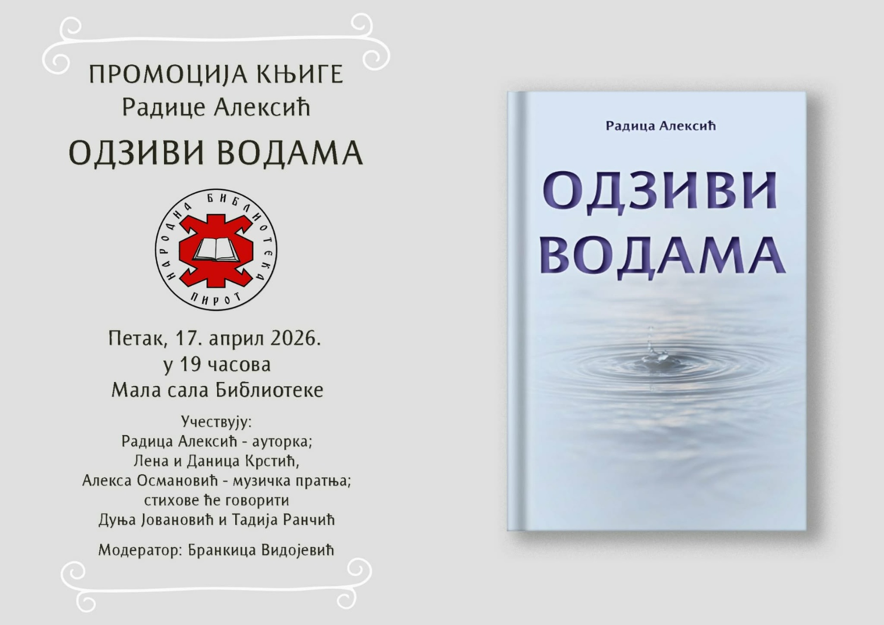 U Maloj sali Narodne biblioteke Pirot, u petak, 17. aprila 2026. godine sa početkom u 19 časova, biće održana promocija knjige “Odzivi vodama” autorke Radice Aleksić.