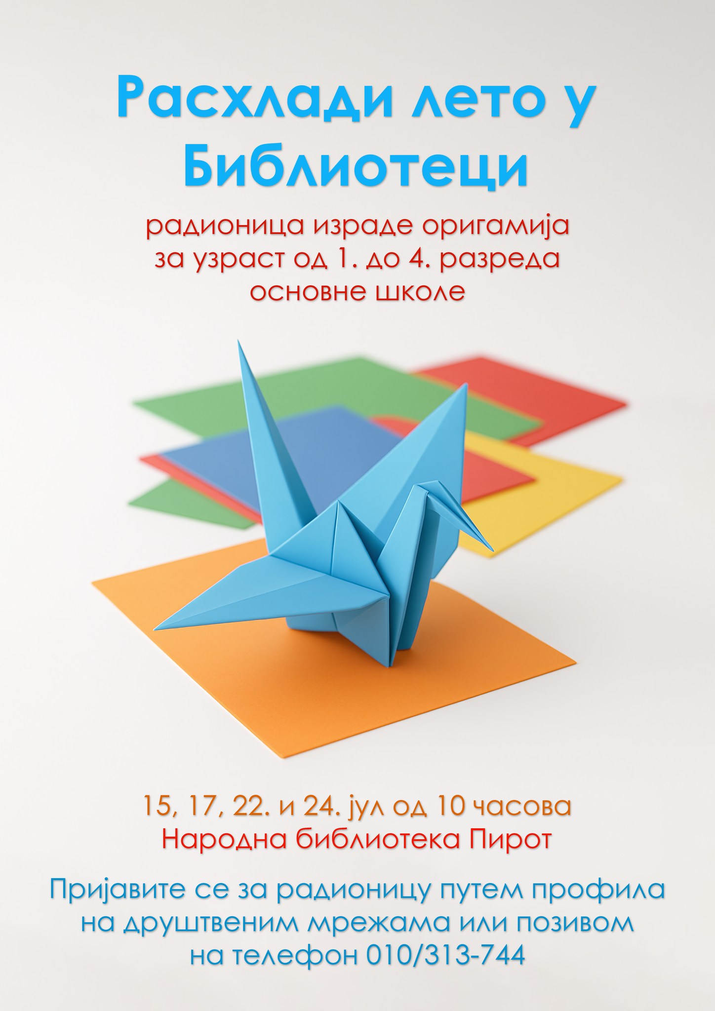 Narodna biblioteka Pirot organizuje besplatnu radionicu izrade origamija za decu od 1. do 4. razreda osnovne škole pod nazivom “Rashladi leto u Biblioteci”. Radionica će se održavati 15, 17, 22. i 24. jula sa početkom u 10 časova.