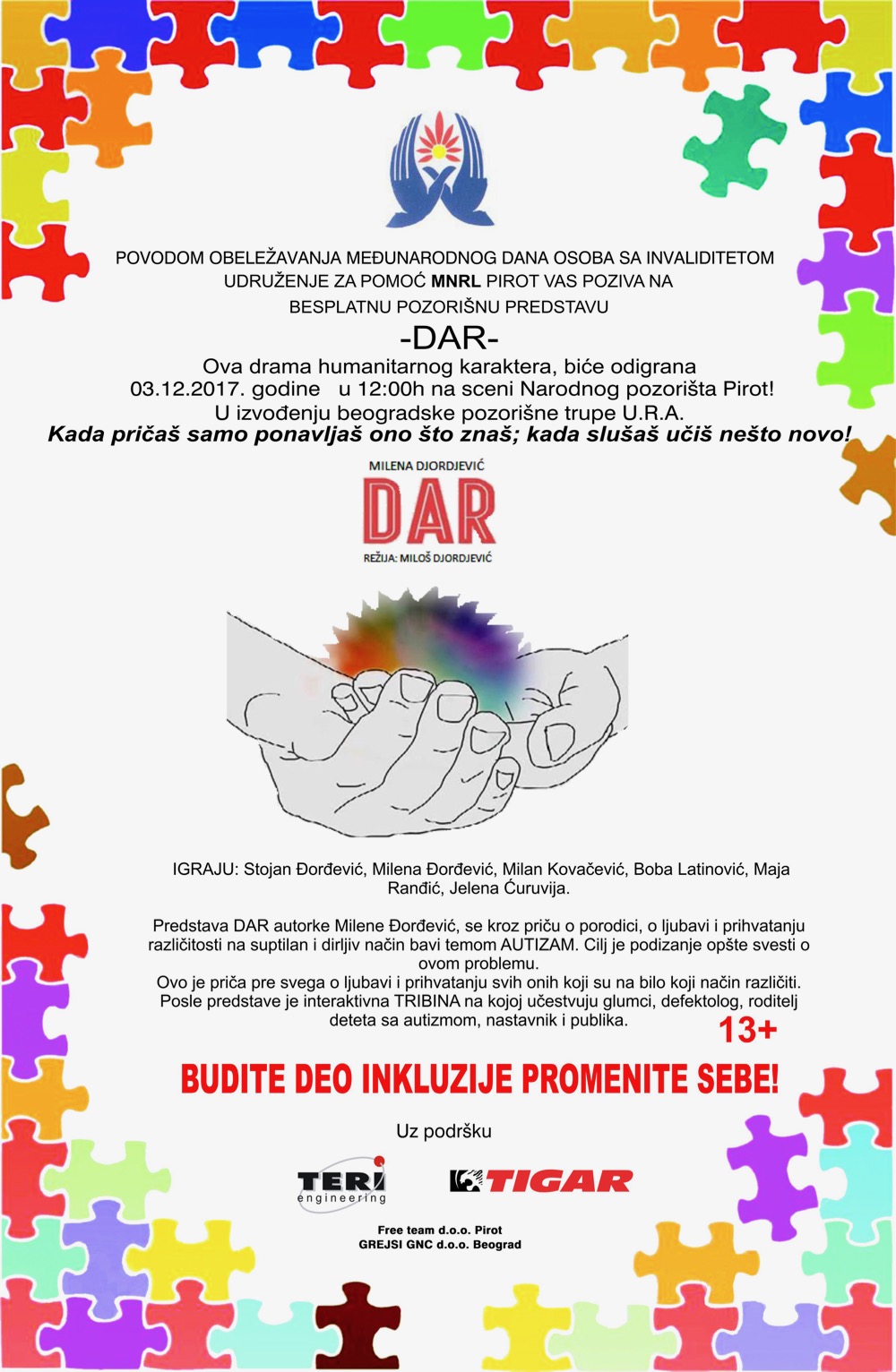 Povodom obeležavanja Međunarodnog dana osoba sa invaliditetom Udruženje za pomoć MNRL Pirot organizuje besplatnu pozorišnu predstavu Dar. Predstava DAR, autorke…