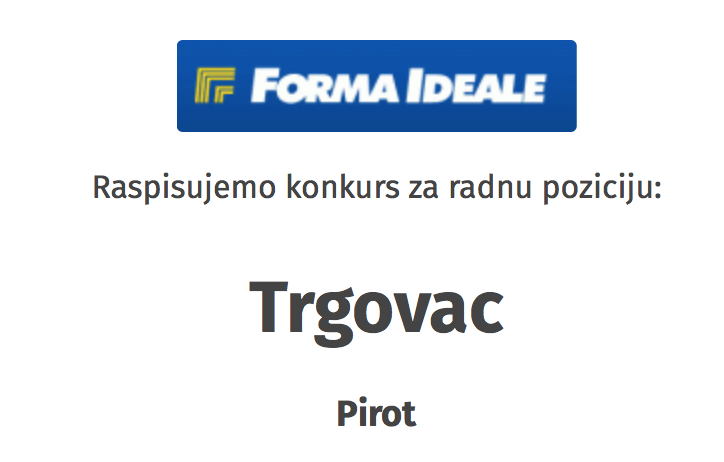 Kompanija Forma Ideale, objavila je konkurs za zapošljavanje u budućem velikom prodajnom objektu u Pirotu koji se gradi pored postojećeg objekta…