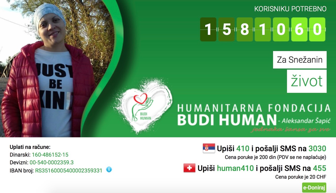 Humanitarna fondacija BUDI HUMAN – Aleksandar Šapić prikuplja novčana sredstva za Snežanu Đorđević (1987).Snežani je 2017. godina počela neočekivano. Usled…