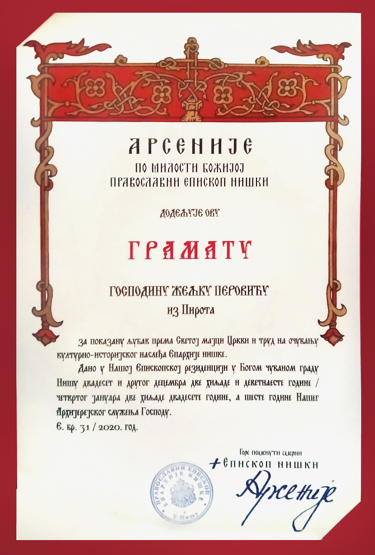 Vladika niški Arsenije našem sugrađaninu Željku Peroviću uručio značajno priznanje – arhijerejsku gramatu – za očuvanje arhivske crkvene građe