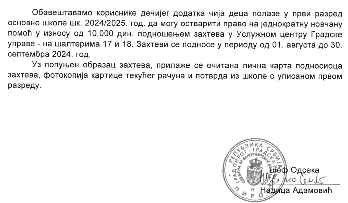 Iz Gradske uprave obaveštavaju korisnike dečjeg dodatka čija deca polaze u prvi razred osnovne škole da mogu ostvariti pravo na jednokratnu novčanu pomoć u iznosu od 10000 dinara podnošenjem zahteva u Uslužnom centru Gradske uprave, na šalterima 17. i 18. Zahtevi se podnose u periodu od 1. avgusta, dakle od danas, pa do 30. avgusta, saopštavaju iz Gradske uprave Pirot.
